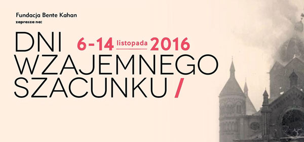 W dniach 6-14 listopada Fundacja Bente Kahan zaprasza na cykl imprez, które złożą się na organizowane we Wrocławiu Dni Wzajemnego Szacunku. W programie wydarzeń m.in. projekcje filmowe, koncerty, wystawy i przedstawienie teatralne. Większość wydarzeń odbywać się będzie w Synagodze pod Białym Bocianem, ale również na dziedzińcu przed nią, jak i w Kinie Nowe Horyzonty. Program kolejnych dni prezentujemy poniżej, szczegóły wydarzeń znaleźć można na stronie fbk.org.pl.