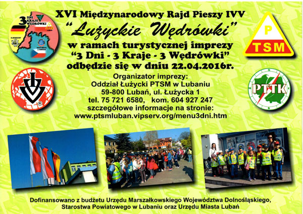 Oddział Łużycki PTSM w Lubaniu serdecznie zaprasza grupy zorganizowane i indywidualnych turystów pieszych Dolnego Śląska, a szczególnie członków PTTK i PTSM oraz wędrowców Polskiej Federacji Popularyzacji Turystyki na XVI Międzynarodowy Rajd Pieszy IVV “Łużyckie Wędrówki”. Impreza pod patronatem Euroregionu NYSA wsparta jest finansowo przez Urząd Marszałkowski we Wrocławiu, Starostwo Powiatowe w Lubaniu oraz władze samorządowe: Miasta Lubań, Miasta Gryfów Śląski i Miasta Leśna.