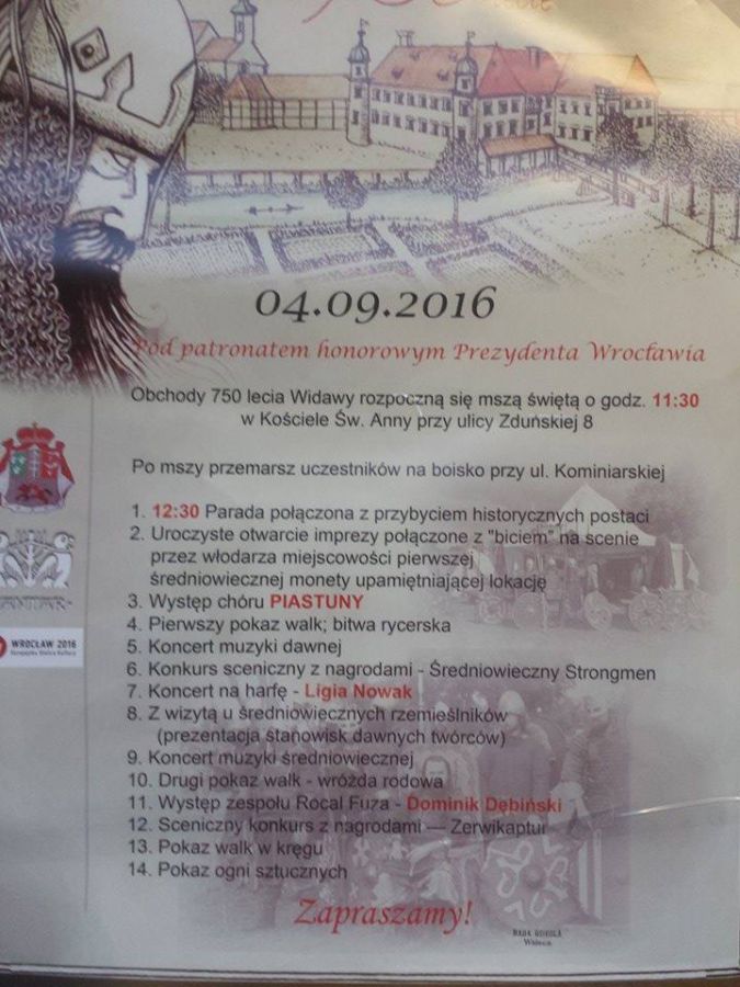W najbliższą niedzielę (4 września) swoje 750-lecie będzie obchodzić Widawa! Z tej okazji odbędzie się Festyn Historyczny, który został objęty patronatem Prezydenta Wrocławia. Obchody 750-lecia Widawy rozpoczną się mszą świętą o godz. 1130 w Kościele Św. Anny przy ulicy Zduńskiej 8. Po mszy nastąpi przemarsz uczestników na boisko. Stroje średniowieczne mile widziane!