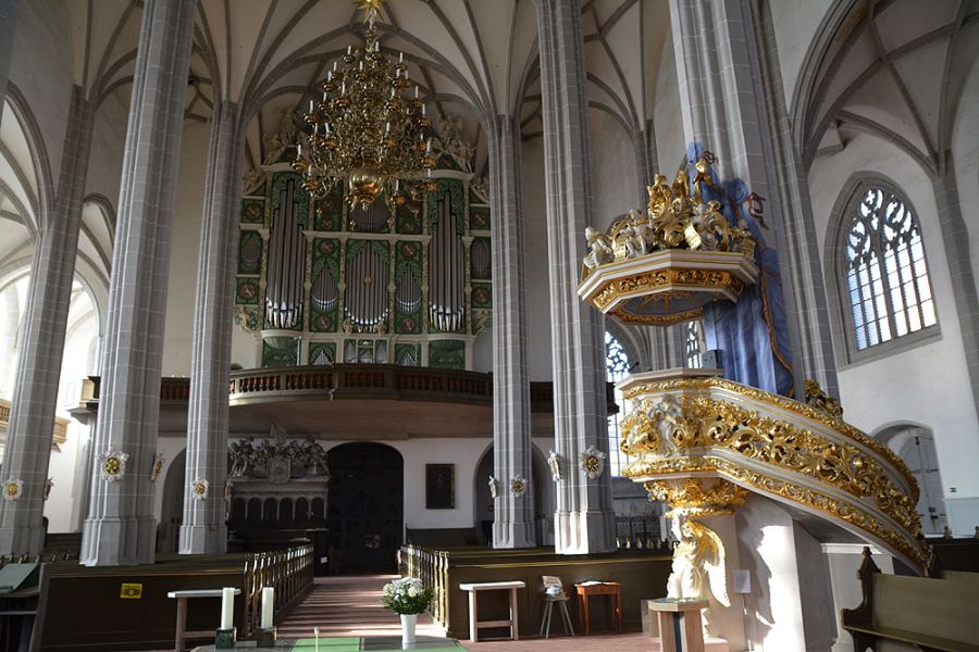Najsłynniejszym zabytkiem wewnątrz kościoła są XVII-wieczne „organy słoneczne” z piszczałkami ułożonymi w kształt promieni Słońca. Podobno do gry na nich trzeba było użyć takiej siły, że, według Jana Sebastiana Bacha, należało być raczej koniem niż człowiekiem. Zdekompletowane organy przez wiele lat nie były używane, ale w latach 90. XX wieku zorganizowano zbiórkę pieniędzy na rekonstrukcję instrumentu i obecnie co niedzielę o godzinie 12:00, a latem – trzy razy w tygodniu można wysłuchać wykonywanych na mim utworów. W południowo-zachodniej części kościoła można zobaczyć inny dość niezwykły zabytek. Jest to skrzynia pozostawiona tutaj przez niesławnego dominikanina Johanna Tetzela, który prowadzoną przez siebie sprzedażą odpustów miał doprowadzić Marcina Lutra do wystąpienia przeciw Kościołowi. Podobno połowa zebranych w Zgorzelcu pieniędzy została w tej właśnie skrzyni pozostawiona na remont kościelnego dachu.