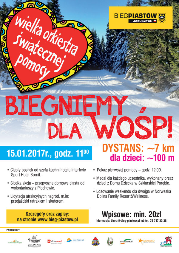 W najbliższą niedzielę 15 stycznia na Polanie Jakuszyckiej możemy aktywnie przyłączyć się do akcji Wielkiej Orkiestry Świątecznej Pomocy. Zapraszamy do udziału w Biegu Piastów na dystansie – 7 km (dorośli) i 100 m (dzieci). W biegu wykorzystane zostaną trasy przygotowane na sobotnią Jakuszycką Siódemkę.