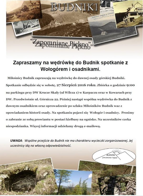 Miłośnicy Budnik zapraszają na wędrówkę do dawnej osady górskiej Budniki. Spotkanie odbędzie się w sobotę, 27 sierpnia 2016 roku. Zbiórka o godzinie 9:00 na parkingu przy DW Krucze Skały (ul. Wilcza 1) w Karpaczu oraz w Kowarach przy DW Przedwiośnie (ul. Górnicza 22). Później nastąpi wspólna wędrówka do Budnik z dawnym osadnikiem oraz oprowadzenie po szlaku Miłośników Budnik wraz z opowiadaniem hostorii osady...