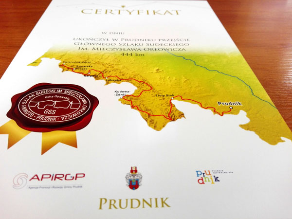 Certyfikat można otrzymać w Prudniku w kilku miejscach, np. w schronisku młodzieżowym „Dąbrówka”, w redakcji „Tygodnika Prudnickiego”, w siedzibie Agencji Promocji i Rozwoju Gminy Prudnik ratuszu, a także przy Wieży Woka – jednej z najciekawszych atrakcji miasta. Certyfikat jest wręczany w dniu ukończenia przejścia, jest imienny i wypisywany ręcznie, jeśli więc macie ochotę na pamiątkę z przejścia GSS, zapraszamy do Prudnika.