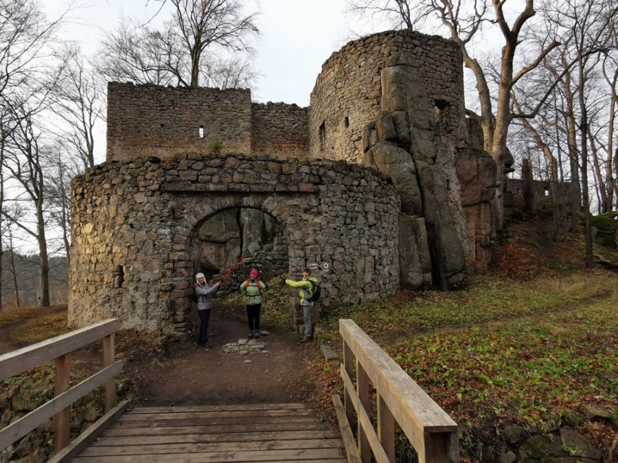 Następnie wracamy tą samą drogą do szlaku niebieskiego i kierujemy się na Lwią Górę (718 m). Przed wejściem na Lwią Górę podziwiamy Starościańskie Skały. Ze szczytu Lwiej Góry ponownie podziwiamy panoramę Sudetów. Dalej idziemy niebieskim szlakiem i na rozwidleniu wchodzimy na szlak czarny, którym zmierzamy do Zamku Bolczów. Są to ruiny zamku, który został wtopiony w naturalne skały. Po zwiedzeniu, zielonym szlakiem udajemy się do Janowic Wielkich.