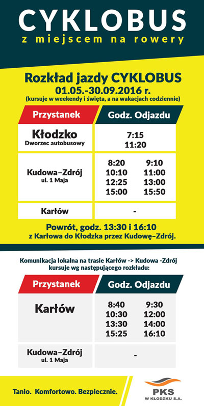 Autobusy kursują na trasie Kłodzko – Kudowa-Zdrój – Karłów w weekendy (sobota, niedziela) w okresie od 1 września do 30 września 2016 r. W czasie wakacji (a więc do 31 sierpnia 2016 r.) autobusy kursują codziennie. Szczegółowych informacji dotyczących przewozów cyklobusem udziela Dział Przewozów Pasażerskich w Kłodzku, tel. 697 707 363.
