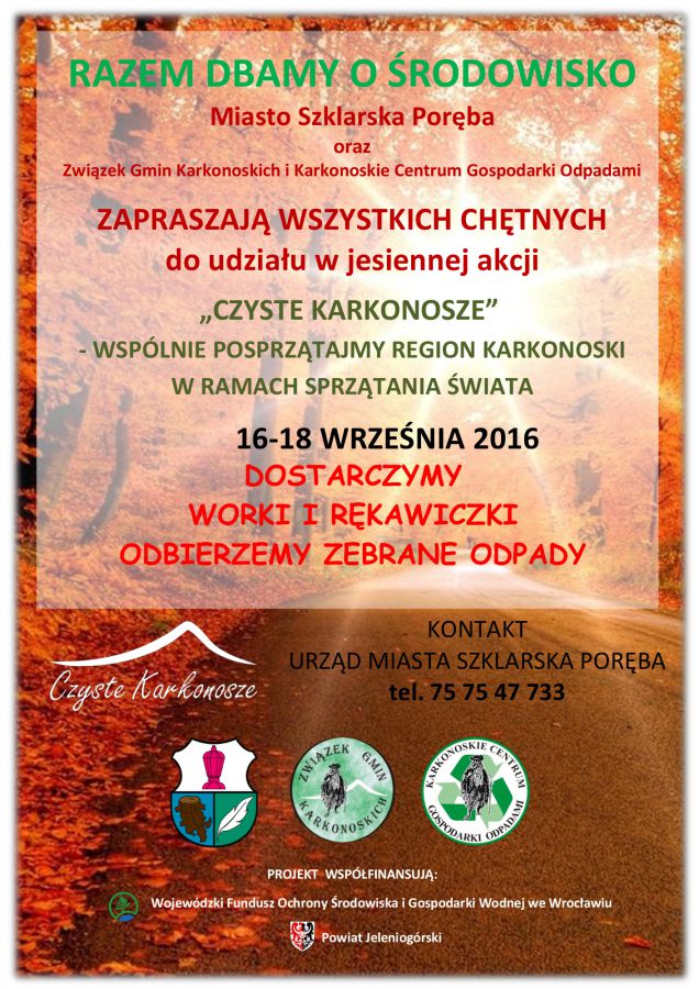 Już jutro rusza jesienna akcja „Czyste Karkonosze”! W dniach 16-18 września Miasto Szklarska Poręba, Związek Gmin Karkonoskich i Karkonoskie Centrum Gospodarki Odpadami zapraszają wszystkich chętnych do wspólnego sprzątania regionu karkonoskiego. Osoby, które zechcą pomóc w jesiennych porządkach otrzymają worki na śmieci oraz rękawiczki. Swoją chęć do udziału w akcji można zgłaszać pod numerem telefonu: 75 75 47 733.