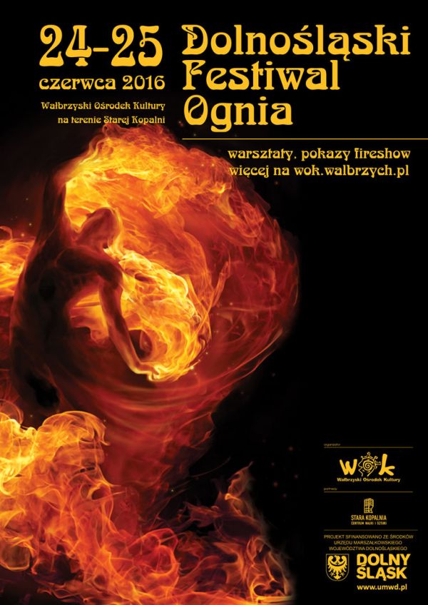 Dolnośląski Festiwal Ognia to nowa propozycja Wałbrzyskiego Ośrodka Kultury, organizowana dzięki dofinansowaniu Urzędu Marszałkowskiego Województwa Dolnośląskiego. Dwudniowe wydarzenie odbędzie się z okazji rozpoczęcia wakacji. Zostanie połączone z "Lata Start! Rozpoczęcie wakacji 2016 w Starej Kopalni". Do Wałbrzycha zostaną zaproszeni kuglarze z Dolnego Śląska. Wezmą udział w warsztatach prowadzonych przez teatr AVATAR, by później stanąć do rywalizacji. Publiczność nie tylko będzie mogła się przyglądać, organizatorzy zaproszą ją do wspólnej zabawy. Nauczymy kręcić flagami, poi, kijami. Być może wielu z Was dołączy do tancerzy grupy ognia Impuls w Wałbrzyskim Ośrodku Kultury. Zapraszamy na Dolnośląski Festiwal Ognia już 24-25 czerwca 2016 roku.