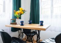 Również nazwa Domu Krawca nawiązuje do historii. Gdy na początku remontu nowi właściciele oczyszczali ściany budynku, spod warstwy tynku wyłonił się napis: „E. Bergmann Schneidermeister”. Księgi adresowe Sobieszowa z lat 1927-1937 potwierdzają, że w tym czasie mieszkał tu mistrz krawiecki Eduard Bergmann. Nie trzeba więc było szukać pomysłu na nazwę. Pamiątek po krawcu wprawdzie na miejscu nie było, ale historycznego sprzętu krawieckiego nie brakuje na aukcjach internetowych, udało się więc zebrać sporą kolekcję zabytkowych maszyn do szycia. Można je dziś zobaczyć w podświetlanych witrynach we wnękach sali w piwnicy, a na ich żeliwnych stojakach umieszczono stoły w pokojach dla gości. Ozdobne pudła po maszynach stoją na półce w turystycznej kuchni-jadalni na parterze domu. Poszczególne pokoje otrzymały nazwy producentów maszyn, a mały domek-apartamencik w ogrodzie – również krawiecką nazwę „Naparstek”.
