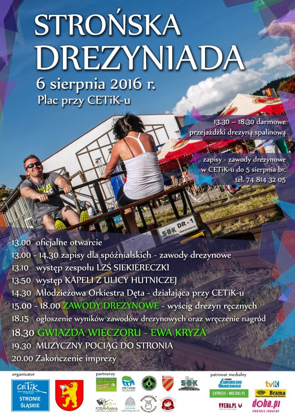 Serdecznie zachęcamy do udziału w "Strońskiej Drezyniadzie", która odbędzie się 6 sierpnia 2016 r. (sobota) przy CETiK-u w Stroniu Śląskim. Rozpoczynamy o godz. 13:00. W programie m.in.: zawody drezyn ręcznych, występy zespołów muzycznych, dobra zabawa. Zawody będą odbywały się w kategoriach: VIP, Open, Rodzina, Kobiety i Mężczyźni. Zapewniamy wartościowe nagrody! Za pobicie rekordu najszybszego przejazdu - nagroda pieniężna ufundowana przez Radnych Gminy Stronie Śląskie!
