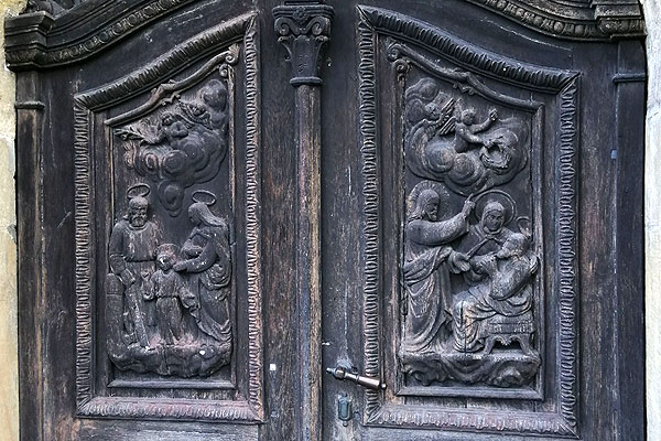 Płaskorzeźbione sceny z życia św. Józefa na drzwiach kościoła. Fot. Waldemar Brygier