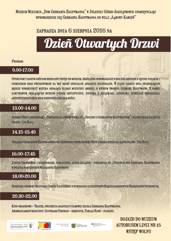 Muzeum Miejskie „Dom Gerharta Hauptmanna” upamiętniając wprowadzenie się Gerharta Hauptmanna do Willi „Łąkowy Kamień” zaprasza w dniu 6 sierpnia w godzinach 9:00 – 20:30 na Dzień Otwartych Drzwi.