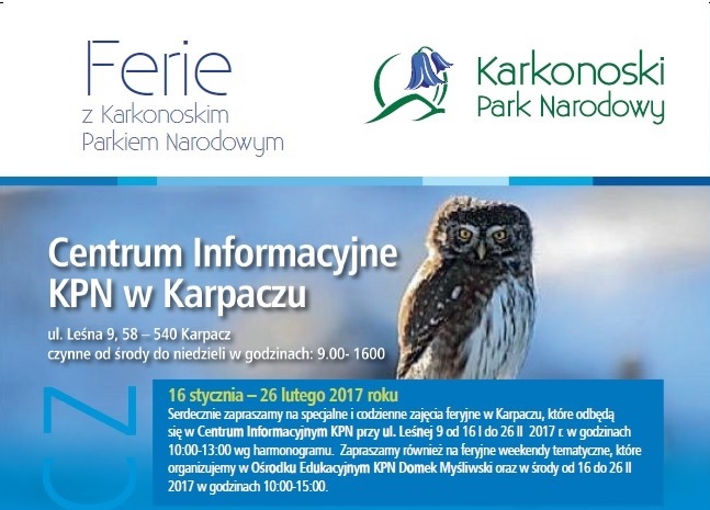Karkonoski Park Narodowy zaprasza od 16 stycznia do 26 lutego na feryjne zajęcia edukacyjne, które odbywać się będą w Centrum Informacyjnym KPN w Karpaczu (ul. Leśna 9) w godzinach 10.00 - 13.00, w Domku Myśliwskim (ul. Na Śnieżkę, przy niebieskim szlaku prowadzącym od Świątyni Wang do schroniska „Samotnia”) w weekendy (piątek, sobota, niedziela) oraz w środy w godzinach 10.00 - 15.00., oraz w Centrum Informacyjnym KPN od środy do niedzieli w godzinach 10.00 - 15.00.