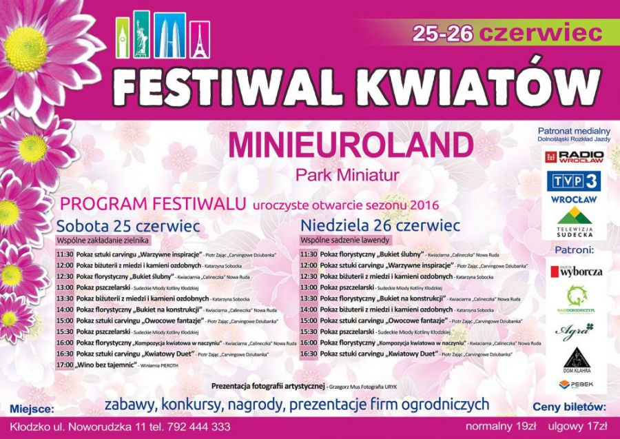Największa impreza kwiatowa na Dolnym Śląsku - Festiwal Kwiatów Minieuroland 2016. Wielkie otwarcie w weekend 25-26 czerwca. W ramach tego wydarzenia zostało wykonanych blisko 50 000 nasadzeń jednorocznych kompozycji kwiatowych takich jak: niecierpki, begonie, hortensje, petunie, surfinie, pelargonie, lobularie, mecardonie. Bajeczne dywany kwiatowe, a w nich zatopione perełki architektury sprawią, że każdy będzie mógł poczuć się jak Alicja w zaczarowanym ogrodzie.