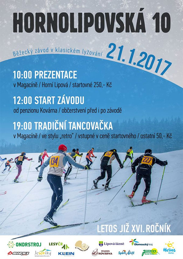 Horní Lipová stanie się w trzecią sobotę stycznia sceną tradycyjnych zawodów w klasycznym narciarstwie biegowym Hornolipovská 10. Organizowana już po raz szesnasty popularna impreza sportowa rozpocznie się 21 stycznia w samo południe w okolicy Pensjonatu Kovárna, jednak jeszcze wcześniej, od godziny 10, odbędzie się prezentacja zawodników w miejscowej Magacínie.