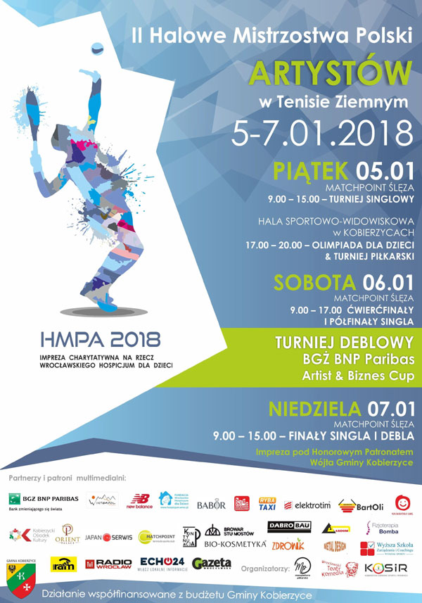 Od 5 do 7 stycznia 2018 roku, na kortach klubu Matchpoint w Ślęzie, w gminie Kobierzyce, odbędą się II Halowe Mistrzostwa Polski Artystów w Tenisie Ziemnym. Swój udział zapowiedzieli m.in. Karol Strasburger, Przemysław Sadowski, Michał Milowicz, Tomasz Jachimek, Krzysztof Hanke i cała plejada artystów z kabaretów: Hrabi, Jurki, Koń Polski, Rak czy Neo-Nówka. Rywalizację na korcie zaplanowano na trzy dni. W piątek rozpoczyna się turniej singlowy, w sobotę ćwierćfinały i półfinały singla oraz turniej deblowy BGŻ BNP Paribas BIZNES CUP. Niedziela to czas na ostateczne rozstrzygnięcia, czyli finały.