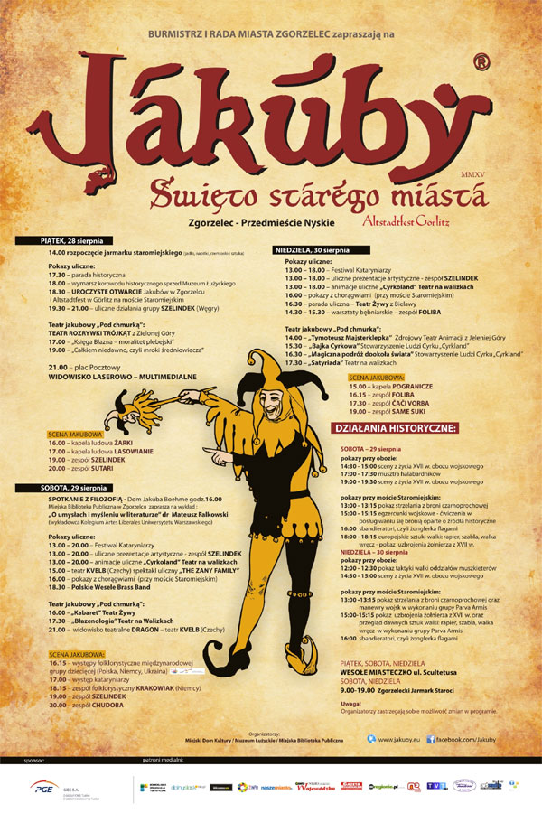 Jakuby rozpoczną się w piątek, 28 sierpnia. Na Przedmieściu Nyskim wystąpią tego dnia zespoły muzyczne oraz Teatr Rozrywki Trójkąt z Zielonej Góry, a atrakcją wieczoru będzie pokaz światło i dźwięk z wykorzystaniem kolorowych laserów, które opowiedzą widzom historię Jakuba Boehme. Kolejne dni to kolejne atrakcje, m.in. Międzynarodowy Festiwal Kataryniarzy!