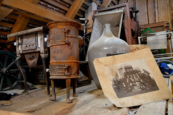 Na piętrach starszego z domów zobaczymy różne ekspozycje tematyczne. Najpierw – związane z produkcją i pielęgnacją ubioru: warsztat tkacki, maszynę do szycia i szafę z ubraniami, kolekcję urządzeń obrazujących historię prania – od kijanek przez różne tary po proste, lecz sprytne pralki z obracanym korbą, ponacinanym jak tara walcem umieszczonym wewnątrz również ponacinanego w ten sposób bębna, z dołączoną wyżymaczką. Do tego – magiel i kolekcję żelazek. W części „rolniczej” można zobaczyć wialnie (dmuchawy), kosy do trawy i zboża, cepy, motyki, podłużne cysterny do wywożenia gnojowicy na pole, łopaty do zboża, ręczne siewniki, sieczkarnie do słomy na strzechy i osełkę do kos. W innej części I piętra zlokalizowano „historyczne” biuro, a dalej - sprzęt pszczelarski: ule, podkurzacze, skrzyneczkę do łapania rojów, pudełko dla matki pszczelej i wirówkę do miodu.