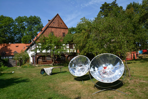 Na podwórzu można zobaczyć letnią kuchnię m.in. z tradycyjnym piecem chlebowym, ale również przekonać się, że gospodarze nie rezygnują całkiem z najnowszych osiągnięć techniki. W pogodne dni stoją tam kuchenki słoneczne, wykorzystujące energię słoneczną do gotowania potraw. Jak informują użytkownicy, w pełnym słońcu litr wody gotuje się 10-15 minut.