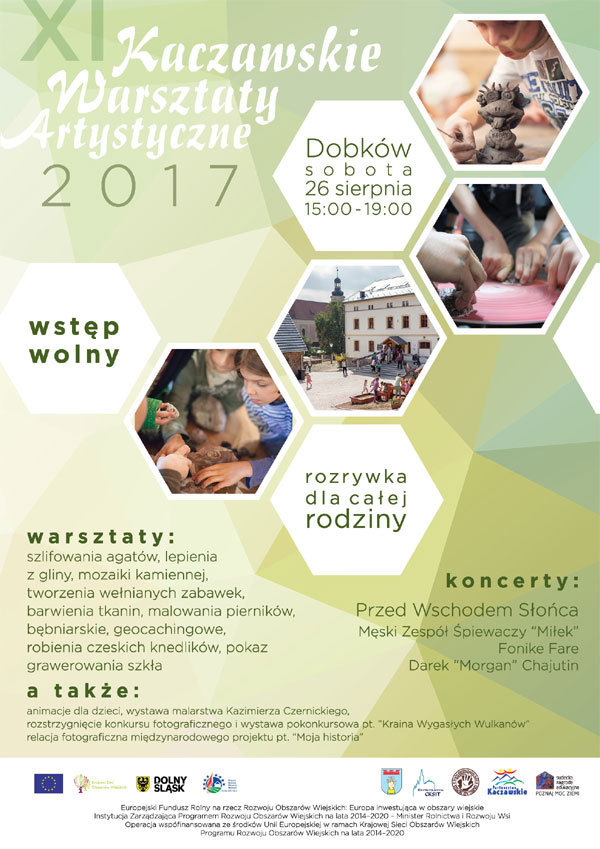 W sobotę, 26 sierpnia 2017 r. (w godzinach 15:00 – 19:00), Dobków zaprasza na Kaczawskie Warsztaty Artystyczne, rodzinną imprezę plenerową z wieloma ciekawymi warsztatami i stoiskami z lokalnym rękodziełem. Na pewno nie będzie: plastikowych zabawek i dmuchanych trampolin, za to będzie: dużo kreatywnej, rodzinnej zabawy z gliną, kamieniem, muzyką, papierem i nie tylko!