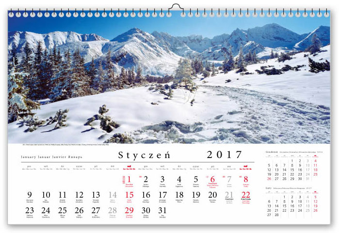 Ekskluzywny kalendarz panoramiczny, prezentujący najpiękniejsze miejsca Tatr polskich i słowackich. Piękne pejzaże wydrukowane na wysokiej jakości kredzie. Praktyczne kalendarium z imieninami i świętami oraz dodatkowym skróconym kalendarium bocznym. Kalendarz zapakowany w praktyczną foliową torbę z uchwytami.
