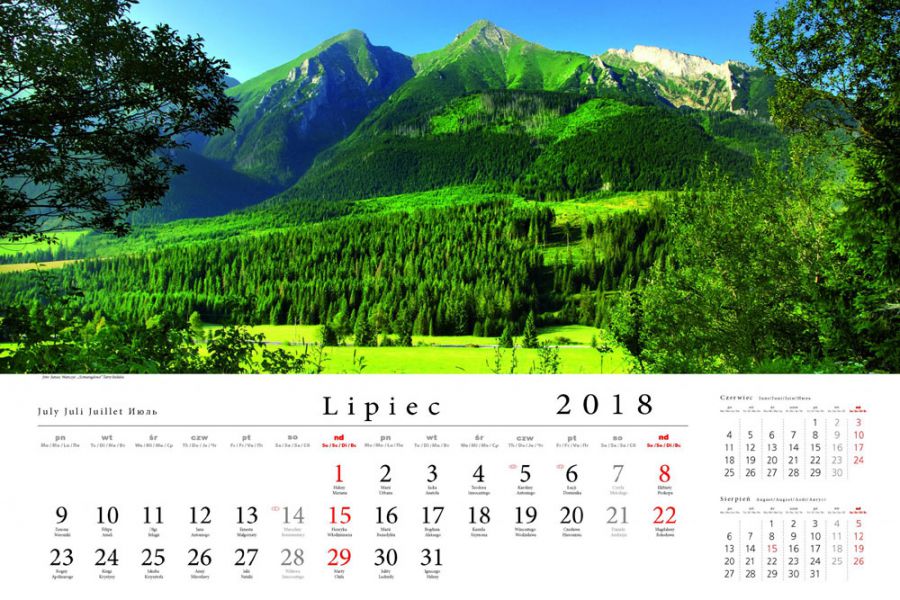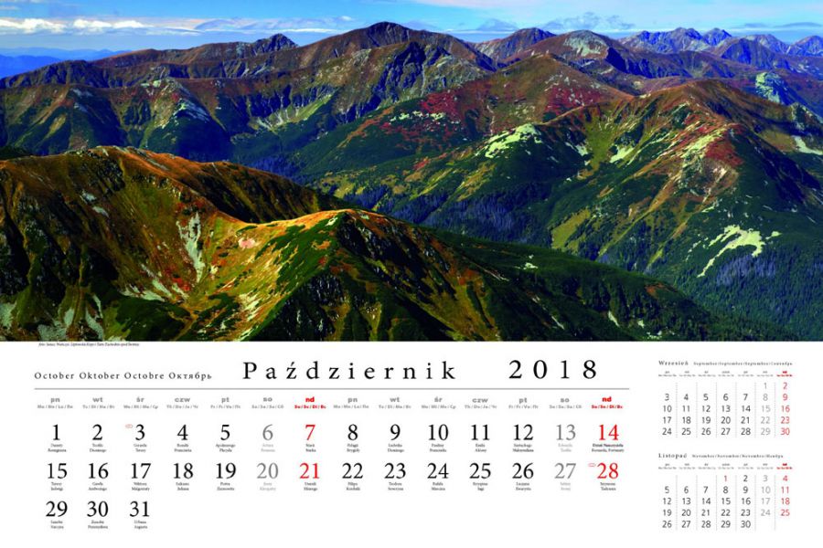 Ekskluzywny kalendarz panoramiczny, prezentujący najpiękniejsze miejsca Tatr polskich i słowackich. Piękne pejzaże wydrukowane na wysokiej jakości kredzie. Praktyczne kalendarium z imieninami i świętami oraz dodatkowym skróconym kalendarium bocznym. Kalendarz zapakowany w praktyczną foliową torbę z uchwytami.