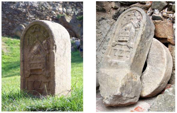 Zakończone półkoliście słupki są ociosane i pozbawione oryginalnych napisów i dekoracji, a w to miejsce widać wykute symbole Czechosłowacji (CS) i Niemiec (D), obecnie zamalowane i przerobione na C i P. Ich pierwotne przeznaczenie ujawnia się w dolnej części, zakopanej w ziemi – widać tam fragmenty charakterystycznego wgłębionego obramowania słupków ”cysterskich” i fragmenty daty 1727.