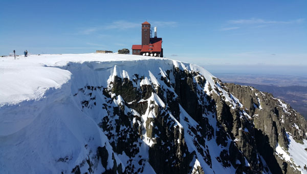 Gdy dotarłem na grzbiet ujrzałem oddalone nieco schronisko na Szrenicy. Wyglądało nawet całkiem ciekawie. Pamiętam bowiem jego widok z lata kiedy to było widać paskudny kolor elewacji. Teraz w okresie zimowym barwa ta jakby nieco osłabła i budynek wygląda znacznie lepiej. Idę dalej pod górkę. Z lewej strony widać skały na Łabskim Szczycie, takie niby nieduże a jednak. Widzę jak jeden z narciarzy próbuje na nie wjechać. Nie bardzo mu się to udaje. W końcu rezygnuje, zdejmuje narty i wdrapuje się na nie pieszo. Ja idę wciąż w stronę widocznego schroniska nad Śnieżnymi Kotłami. Jego wygląd zmienia się wraz z moim przybliżaniem się. Staje się ono coraz większe. Już nie sprawia wrażenia budki. Gdy docieram pod sam budynek mogę przyjrzeć się urządzeniom stacji nadawczej, które zamontowano tutaj. Ludzi jest coraz mniej. Krąży tylko kilka grup. Jedni robią sobie pamiątkowe zdjęcia, drudzy podziwiają widoki. Niestety, zwłaszcza narciarze, mają za nic ustawione tu tablice ostrzegające o niebezpieczeństwie. Niektórzy z nich przejeżdżają nad przysypanymi śniegiem łańcuchami aż na nawisy śnieżne, które mogą w każdej chwili oberwać się i zsunąć na dół w przepaść.