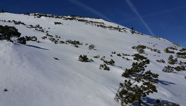 Zupełnym brakiem rozwagi popisali się turyści, których dostrzegłem w dole. Początkowo nawet nie pomyślałem, że to mogą być turyści, jednak gdy przyjrzałem się im bacznie nie miałem wątpliwości. Dlaczego piszę o nich w ten sposób. Otóż po śladach w śniegu widać wyraźnie, że pozwolili oni sobie na zejście żlebem, którym co prawda wiódł kiedyś szlak turystyczny, ale było to jeszcze przed utworzeniem Karkonoskiego Parku Narodowego. Teraz, nawet latem, gdy patrzy się nań z góry widać wyraźnie jak jest to niebezpieczna trasa. Tymczasem tych kilka osób zeszło po niemal pionowej ścianie na dół i teraz torowało sobie w śniegu trasę w stronę Śnieżnych Stawków.