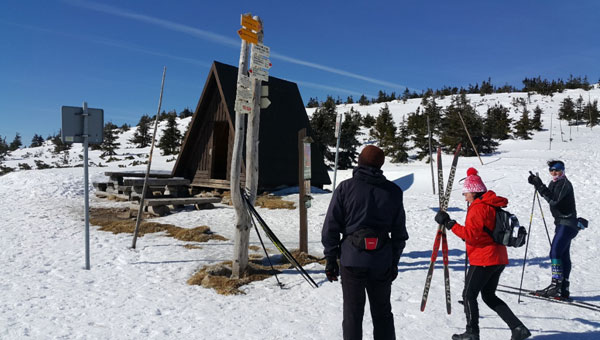 Jestem na Rozdrożu pod Śmielcem (1127 metrów n.p.m.). Teraz na bardzo krótkim odcinku muszę pokonać 200 metrów różnicy wzniesień. I jak wzrokiem sięgnąć, wszędzie widać biel. Wszystko skryte jest pod białym śniegiem. Widać jednak, że ktoś szedł już tędy bo są wydeptane ścieżki. Oczywiście każdy próbował swojego szlaku i ścieżek jest kilka. Trzeba wybrać tą jedną, którą będę podążał. W końcu widzę to, czego się obawiałem. Pojawiają się głębokie po kolana ślady w zmrożonym śniegu. Jest to bardzo niebezpieczne. Trzeba cały czas patrzeć pod nogi. Ale wreszcie jestem na Czarnej Przełęczy (1350 m). Pogoda wciąż dobra, słoneczna, choć wieje wiatr. Widzę jak z Czeskich Kamieni schodzi grupa ludzi. Za chwilę okazuje się, że są to narciarze. Gdy docierają do mnie słyszę język czeski. No tak oni są „niezawodni”. Praktycznie w każdą pogodę, nawet gdy nikt nie wędruje po górach, oni są zawsze. Mniej lub więcej, ale zawsze można spotkać Czechów na szlaku. Jakoś ich nie przeraża nieco słabsza pogoda. Oczywiście nie mówię o sytuacji naprawdę zagrażającej życiu człowieka. Jednak turystów z czeskiej strony Karkonoszy zawsze można spotkać na szlaku. I co ciekawe często zabierają oni w góry swoje pociechy, nawet niemowlaki. Często widać jak ciągną na nartach specjalne wózeczki przeznaczone do przewożenia dzieci.