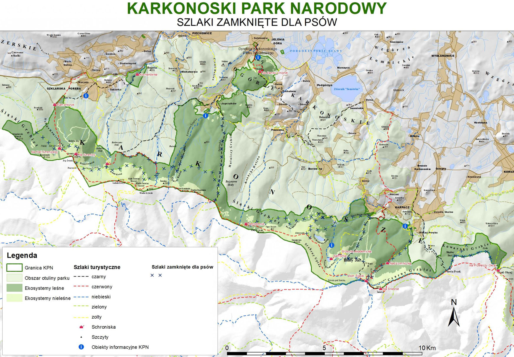 Poniżej przedstawimy mapę przygotowaną przez KPN, która powinna rozwiać wszelkie wątpliwości, które ze szlaków są dostępne, a które nie, dla naszych czworonogów. Cieszy fakt, że w całości jest dostępny szlak grzbietowy (czerwony), niestety zamknięty jest odcinek GSS przez Kocioł Łomniczki. Również wejście na Śnieżkę nie będzie problemem dla turystów z psami, zamknięte za to są szlaki niżej położone, zwłaszcza te, prowadzące przez tereny leśne.