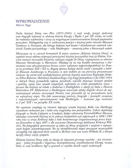 Wydawnictwo poświęcone wystawie o tym samym tytule przedstawia historię klejnotów księżnej wraz ze zdjęciami oraz portrety Daisy. Wystawa „Klejnoty Księżnej Daisy” prezentowana w Muzeum Zamkowym w Pszczynie od 4 czerwca do 30 listopada 2013 r. poświęcona była księżnej pszczyńskiej Daisy von Pless oraz jej bliskim. Centrum ekspozycji czasowej Klejnoty Księżnej Daisy stanowi niezwykła biżuteria, należąca niegdyś do arystokratki, wypożyczona ze zbiorów Muzeum Narodowego w Warszawie. Bogatą oprawę dla klejnotów budują dzieła sztuki i pamiątki z kolekcji Muzeum Zamkowego w Pszczynie oraz zbiorów prywatnych, w tym niektóre po raz pierwszy prezentowane widzom.