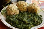 Mokrymi rękoma formujemy z ciasta dość duże kule, ugniatamy je i wkładamy do gotującej się, osolonej wody. Wyciągamy je po ok. 10-12 minutach, gdy wypłyną na wierzch. Podajemy razem ze szpinakiem.