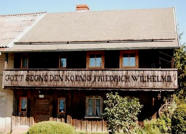 Tyrolski dom w Mysłakowicach z dziękczynnym napisem ku chwale pruskiego króla