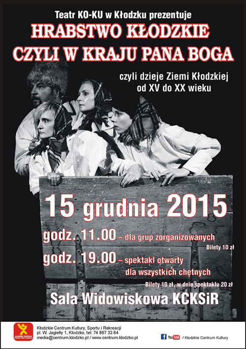 We wtorek, 15 grudnia, Kłodzkie Centrum Kultury, Sportu i Rekreacji zaprasza na spektakl teatralny pt. „Hrabstwo Kłodzkie, czyli w Kraju Pana Boga”. Przedstawienie przygotowane jest przez aktorów teatru KO-KU z Kłodzka w reżyserii ś.p. Mariana Półtoranosa.