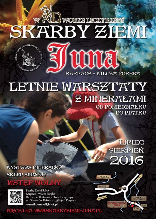 Muzeum Ziemi Minerals & Rocks JUNA przygotowało dla wszystkich, którzy ukończyli 5 rok zycia niezwykle ciekawą wakacyjną ofertę – od poniedziałku do piątku w godzinach 11:00 – 18:00 w Podziemiach Dworu Liczyrzepy – Skarby Ziemi JUNA odbywać się będą warsztaty z minerałami: