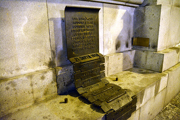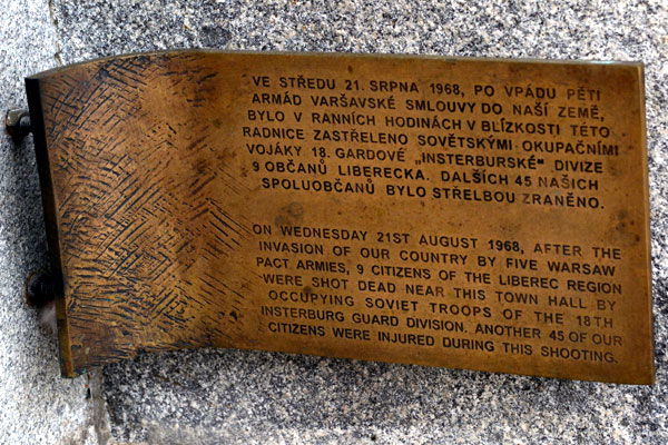 Na rynku od razu rzuca się w oczy piękna sylwetka ratusza, ale o nim znajdziecie informacje w każdym przewodniku, więc pomińmy go i udajmy się id razu pod jego południową ścianę, gdzie po murze spływa czołgowa gąsienica. To pomnik ofiar 1968 roku, kiedy to wojska Układu Warszawskiego wkroczyły do Czechosłowacji. Początkowo pomnik wyglądał nieco inaczej, ale podobno rosyjskojęzyczni turyści powszechnie myśleli, że to pomnik upamiętniający żołnierzy radzieckich, dodano więc nazwiska ofiar. Podczas wydarzeń w 1968 roku informowano o dziewięciu osobach zastrzelonych, w rzeczywistości ofiar było sześć, z czego dwie osoby zginęły pod gruzami budynków, a jedna przygnieciona cysterną.