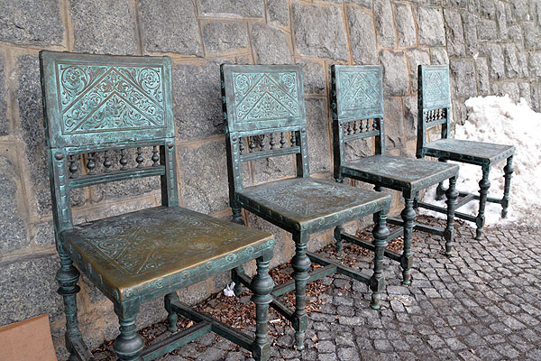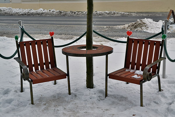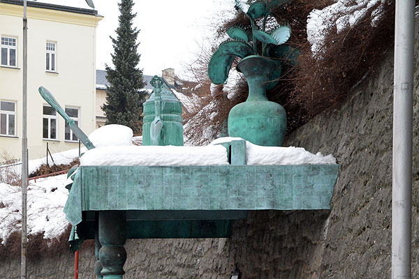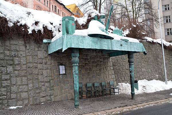 Niemal tuż obok znajduje się niezwykły przystanek autobusowy. To właściwie prawdziwe dzieło sztuki, zatytułowane „Śniadanie olbrzymów”, dzieło czeskiego rzeźbiarza Davida Černego, o którym można napisać kilka oddzielnych artykułów. Całość wykonana jest z patynowanego brązu i wygląda jakby przed chwilą olbrzymy odeszły od stołu. Stół nakryty jest serwetą, a na nim pośniadaniowy bałagan: kufle, butelka wina, przewrócony siedmioramienny świecznik, pudełko po papierosach, dzbanek z kwiatkami, mięsożerne muchołówki, talerz z odciętą ludzką głową, w którą wbity jest nóż i widelec i wielkie muchy w hełmach chodzące po serwecie i nożu. Krzesła przy stole też są z brązu i wzorowane są na niemieckich, XIX-wiecznych meblach. Całość dopełniają wielki kosz na śmieci i talerz, na którym pozostały libereckim parówki z musztardą. Prawda, że brzmi nieźle? Przystanek zaprojektował David Černy w 2003 roku, wykonano go dwa lata później. Dzieło Černego waży 3 tony, sam widelec ma wagę ponad 20 kilogramów. Przystanku strzegą oczywiście policyjne kamery.