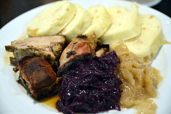 Równie tradycyjne vepřo-knedlo-zelo, tutaj w postaci pieczonego prosiaka z dodatkami