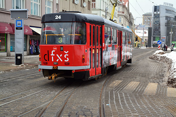 Z Sokolovskiego náměstí ulicą Železną w kilka minut dojdziemy do libereckiego rynku. Gdy już do niego dotrzemy, zerknijmy jedynie na okazały ratusz i wejdźmy w ulicę Pražską, spoglądając uważnie pod nogi. W bruku ulicy wmontowany jest kawałek szyny tramwajowej, która mówi nam, że tędy wiodła w latach 1897-1984 linia tramwajowa. Liberec jest jednym z siedmiu miast w Republice Czeskiej, które posiadają komunikację tramwajową. Pierwszy tramwaj pojechał w Libercu 25 sierpnia 1897 roku trasą z dworca kolejowego do parku miejskiego. Początkowo rozstaw kół wynosił 1000 mm, ale w 1998 roku zaczęto wprowadzać tabor o rozstawie 1435 mm. Szkoda było wyrzucać stare, dobrze jeszcze sprawujące się maszyny, więc w wielu miejscach Liberca zobaczyć możemy torowisko składające się z trzech szyn! Mogą z niego korzystać zarówno tramwaje o wąskim, jak i szerokim rozstawie kół.