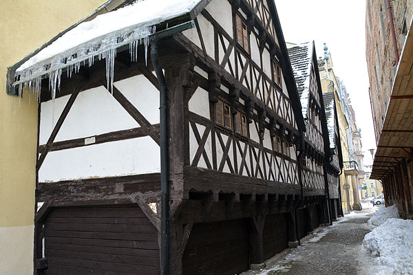 Pozostańmy przy wąskich, krótkich uliczkach i przenieśmy się na ul. Větrną. Ma ona zaledwie 53 metry długości i jest szeroka na 3,25 metra, co stawia ją na pierwszym miejscu w mieście pod względem długości i szerokości jednocześnie. Stoi przy niej kilka domków, które nazwane zostały Valdštejnskimi domkami, mimo że ze słynnym wodzem nie mają nic wspólnego, bo powstały wiele lat po jego śmierci. Zbudowano je w latach 80-tych XVII wieku dla sukienników. Po południowej stronie stało ich pięć, po północnej sześć. W najstarszym z nich (pierwszy od Sokolovskiego náměstí) mieściła się gospoda „U města Petrohradu” (Petrohrad to czeska nazwa Sankt Petersburga). Jedynie trzy, które istnieją do dnia dzisiejszego, oparły się przebudowom w kolejnych wiekach. Po II wojnie światowej utrzymanie domów sukienników pochłaniało ogromne fundusze i po nieudanej próbie rekonstrukcji w 1950 roku oraz częściowemu zawaleniu ich tyłów, planowano je usunąć z rejestru zabytków i w konsekwencji wyburzyć. Szczęśliwie w 1953 roku zaczęła w Libercu funkcjonować szkoła budowlana, której nauczyciele i uczniowie postanowili zaopiekować się budynkami. Prace remontowe i konserwacyjne wykonywano w ramach Akcji Z, czynów społecznych przeprowadzanych w dni wolne od nauki i pracy.
