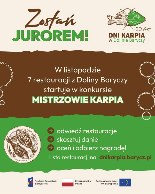 Przez cały listopad, 7. regionalnych restauracji serwować będzie specjalne, konkursowe dania z karpia. Każda restauracja przygotowała jedno wyjątkowe danie, którego nie znajdziemy w ich standardowym menu. Wszystkie potrawy łączy jedno – karp pochodzący wyłącznie z lokalnych Gospodarstw Rybackich Doliny Baryczy, a także produkty od lokalnych dostawców. Wśród propozycji znajdziemy takie specjały jak: