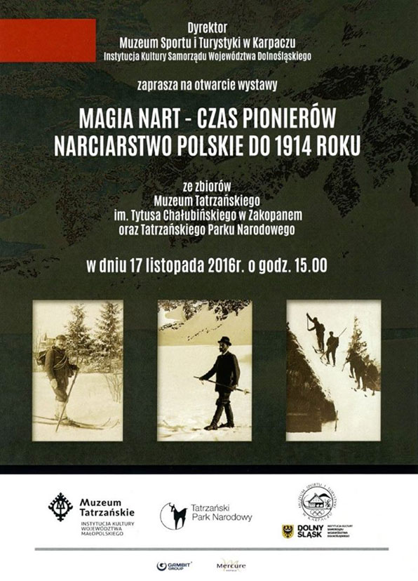 Dyrektor Muzeum Sportu i Turystyki w Karpaczu zaprasza na otwarcie wystawy zatytułowanej " Magia nart - czas pionierów. Narciarstwo polskie do roku 1914" ze zbiorów Muzeum Tatrzańskiego im. Tytusa Chałubińskiego w Zakopanem oraz Tatrzańskiego Parku Narodowego. Wernisaż wystawy odbędzie się 17 listopada 2016 r., o godzinie 15:00, w Muzeum Sportu i Turystyki w Karpaczu, ul. Mikołaja Kopernika 2 (tel. 75 76 19 652, www.muzeumsportu.org).