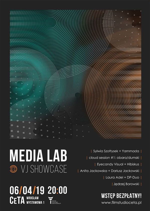 Cykl MEDIA LAB zapoczątkowany został w Centrum Technologii Audiowizualnych CeTA we Wrocławiu w 2015 r. Celem wydarzenia jest promocja nowoczesnych działań twórczych, powstających na styku muzyki elektronicznej, VJ’ingu i nowych mediów. 6 kwietnia 2019 r. w ramach odsłony VJ SHOWCASE ponownie będzie można się zanurzyć w elektronicznych dźwiękach i wyjątkowej, często eksperymentalnej oprawie wizualnej, stworzonej m.in. z wykorzystaniem wieloekranowej projekcji. Wszystko to będzie się działo w industrialnej przestrzeni Studia Filmowego im. Zbyszka Cybulskiego, w której wystąpią w wyjątkowych kolaboracjach twórcy muzyki elektronicznej i artyści wizualni: Sylwia Szołtysek i Yammada, cloud session #1: obara/dumski, Eyecandy Visual i Hibiskus, Anita Jackowska i Dariusz Jackowski, Laura Adel i DP-Duo oraz Jędrzej Borowski.