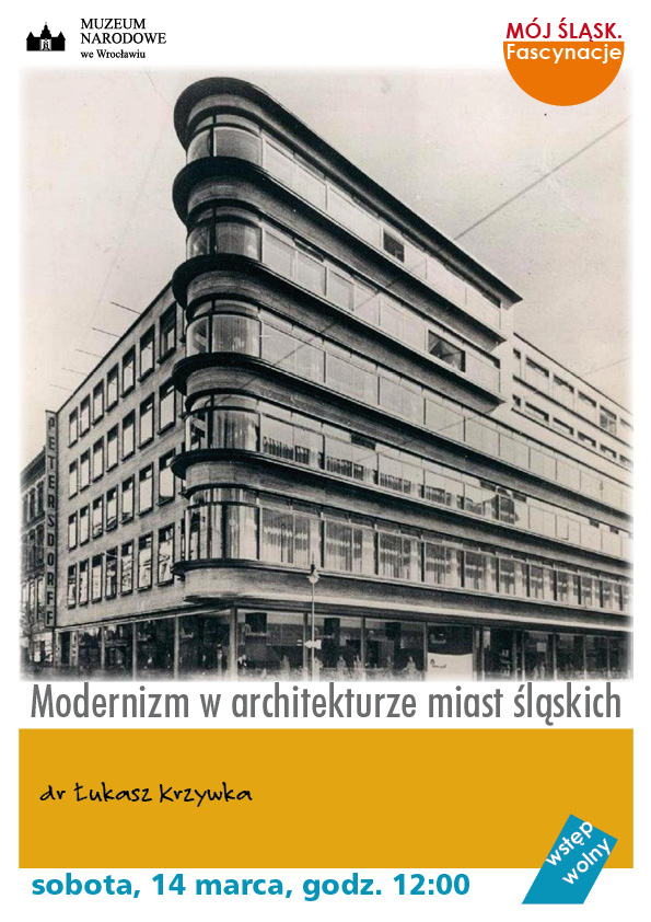 Muzeum Narodowe we Wrocławiu zaprasza na wykład zatytułowany "„Modernizm w architekturze miast śląskich”. Spotkanie odbędzie się w cyklu "Mój Śląsk. Fascynacje", w siedzibie Muzeum Narodowego (pl. Powstańców Warszawy 5), w sobotę, 14 marca, o godz. 12:00. Wstęp wolny. Podczas spotkania poświęconego modernistycznej architekturze dr Łukasz Krzywka przedstawi najbardziej oryginalne i charakterystyczne przykłady budowli z różnych miast śląskich.