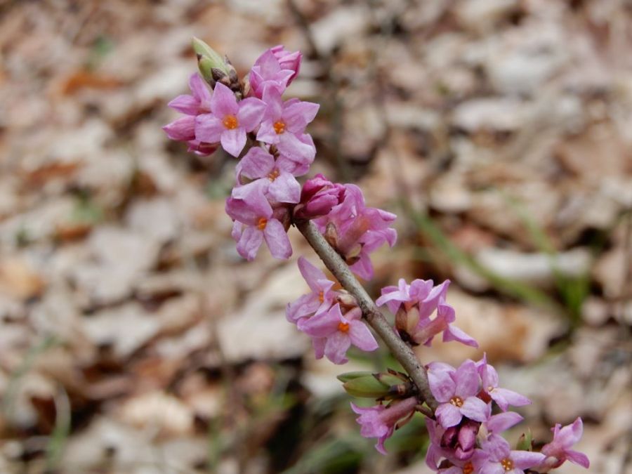 W jednym miejscu, w górnej (zachodniej) części rezerwatu udało mi się wypatrzeć jeszcze jednego zwiastuna wiosny – wawrzynka wilczełyko (Daphne mezereum). Ten mały krzew (wysokość przeważnie ok. 0,5 m) niekiedy zakwita już w lutym przed wypuszczeniem liści, a jego różowe kwiaty mają odurzającą woń.