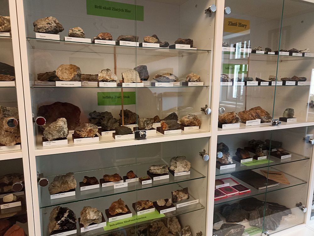 Duża część muzeum poświęcona jest oczywiście zlatohorskiemu górnictwu (w Zlatych Horach znajduje się też Skansen górnictwa złota). Możemy zapoznać się z geologią regionu, zobaczyć wystawę skał i minerałów (w tym skał pochodzenia skandynawskiego z głazów narzutowych), a także modele średniowiecznej i współczesnej sztolni z ich wyposażeniem. Ciekawa jest wystawa artefaktów znalezionych w dawnych kopalniach. Można tu zobaczyć m.in. fragmenty drewnianych rur czy XVII-wiecznych drabin oraz dawne narzędzia górnicze. W innej części ekspozycji zobaczymy m.in. różne lampy górnicze , a także maszyny i pojazdy do transportu urobku. Na tablicach oraz dotykowych panelach można poczytać (również po polsku) o historii eksploatacji zlatohorskich złóż od jej początków w średniowieczu do zakończenia w 1993 r. Opisy wzbogacone są starymi rycinami i zdjęciami ukazującymi pracę górników i wygląd kopalni.