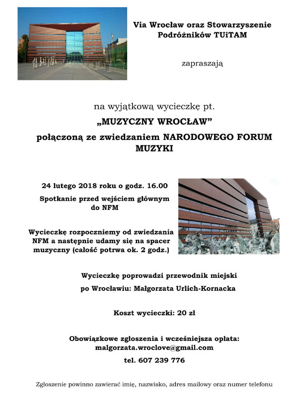 Via Wrocław oraz Stowarzyszenie Podróżników TUiTAM zapraszają na wyjątkową wycieczkę pt. „Muzyczny Wrocław”, połączoną ze zwiedzaniem Narodowego Forum Muzyki. Wycieczka rozpocznie się 24 lutego 2018 roku o godz. 16.00 spotkaniem przed wejściem głównym do NFM. Wycieczkę rozpoczniemy od zwiedzania NFM, a następnie udamy się na spacer muzyczny (całość potrwa ok. 2 godz.). Wycieczkę poprowadzi przewodnik miejski po Wrocławiu: Małgorzata Urlich-Kornacka. Koszt wycieczki: 20 zł, obowiązkowe zgłoszenia i wcześniejsza wpłata: malgorzata.wroclove@gmail.com, tel. 607 239 776 (zgłoszenie powinno zawierać imię, nazwisko, adres mailowy oraz numer telefonu).