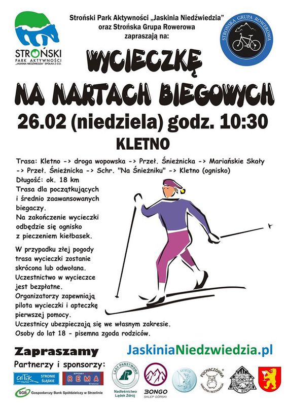 W najbliższą niedzielę - 26 lutego - Stroński Park Aktywności oraz Strońska Grupa Rowerowa zapraszają na wycieczkę na biegówkach w Masywie Śnieżnika. Trasa wycieczki: Kletno – droga wopowska, Przełęcz Śnieżnicka, Mariańskie Skały, Przełęcz Śnieżnicka, Schronisko „Na Śnieżniku", Kletno (długość ok. 18 km). Na zakończenie wycieczki odbędzie się ognisko z pieczeniem kiełbasek. W przypadku złej pogody trasa wycieczki zostanie skrócona lub odwołana. Uczestnictwo w wycieczce jest bezpłatne.