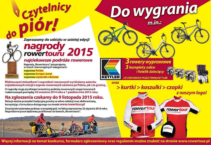 Już po raz szósty redakcja miesięcznika "Rowertour" organizuje konkurs o Nagrodę Rowertouru na najciekawsze podróże rowerowe. Liczba pokonanych kilometróww, niezależnie od kategorii, nie ma znaczenia. Liczy się pomysł na wyprawę, jego realizację i walory turystyczno-krajoznawcze.