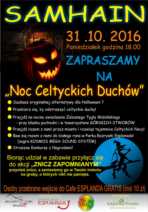 31 października, o godzinie 18:00 zapraszamy do Szklarskiej Poręby na SAMHAIN "Noc Celtyckich Duchów"! Jeśli szukasz oryginalnej alternatywy na Halloween, przebierz się, by odstraszyć celtyckie duchy! Przyjdź na nocne zwiedzanie Żelaznego Tygla Walońskiego - przy blasku pochodni i w towarzystwie górskich stworów. Przejdź z nami przez miasto i rozwiąż tajemnice Celtyckich Nocy! Baw się z nami do białego rana w Parku Rozrywki Esplanada (zagra KOSMOS MEGA SOUND SYSTEM). W programie m.in. straszne konkursy z nagrodami.